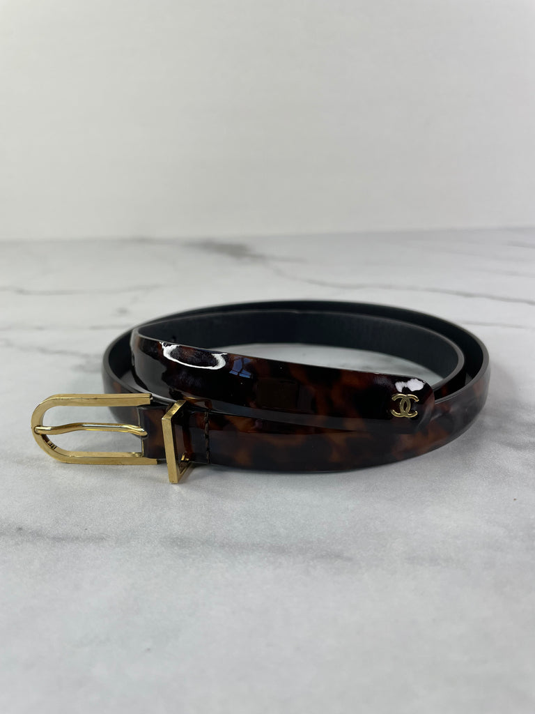 CHANEL CC Brown Leopard Print Patent Leather Skinny Belt