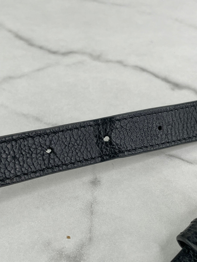 Condition: Excellent condition. 8.5/10. Hardware has surface wear. Exterior has creasing. Interior has signs of use, discoloration red marks under zipper and rub marks. Belt strap has some creasing, minor stretching on belt holes.