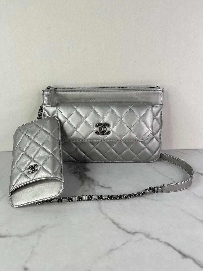 • CHANEL Multi Pochette Metallic Silver Quilted Lambskin clutch/wallet/crossbody/shoulder bag