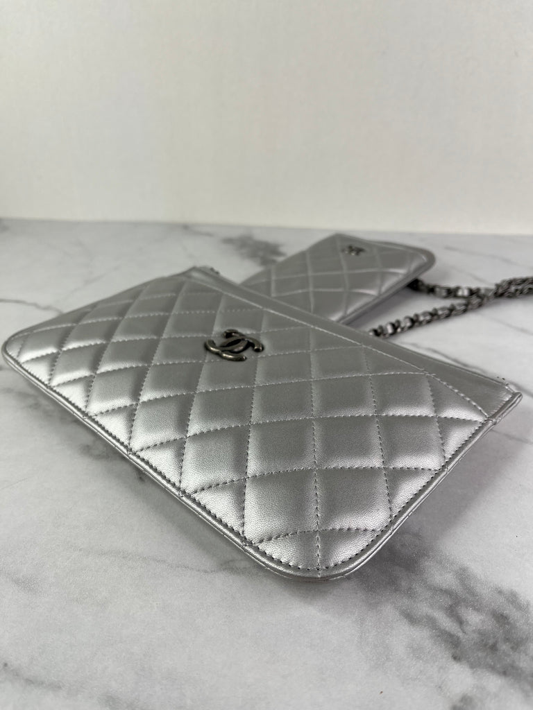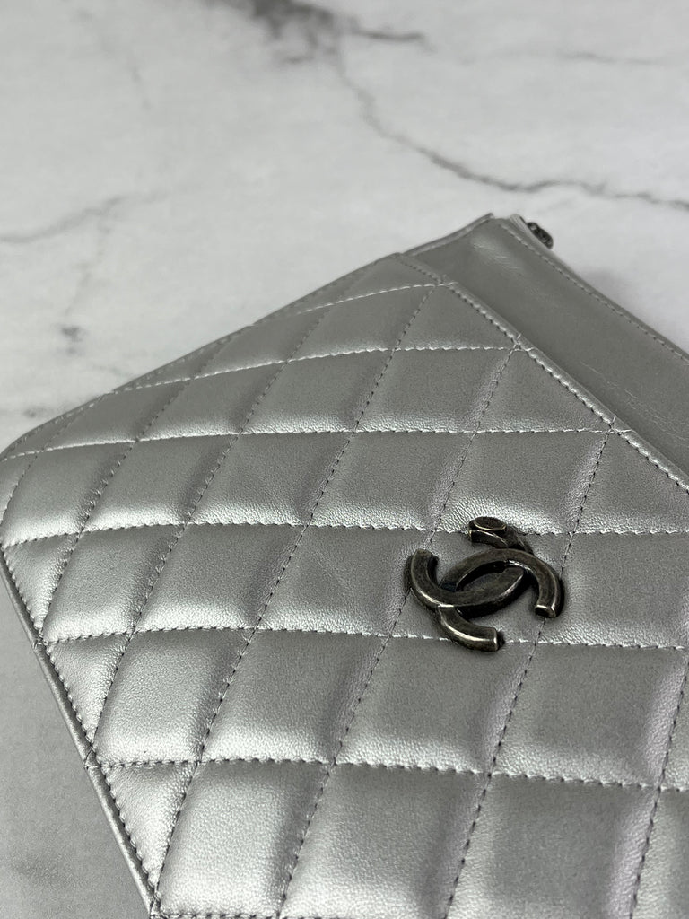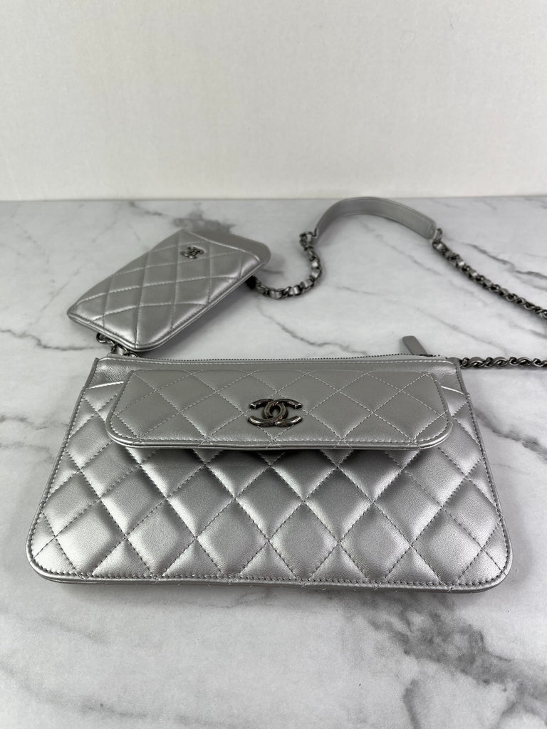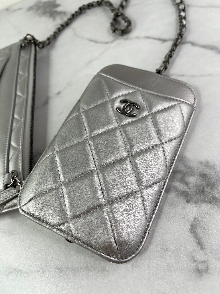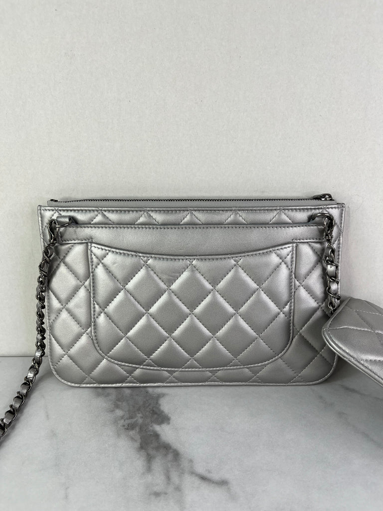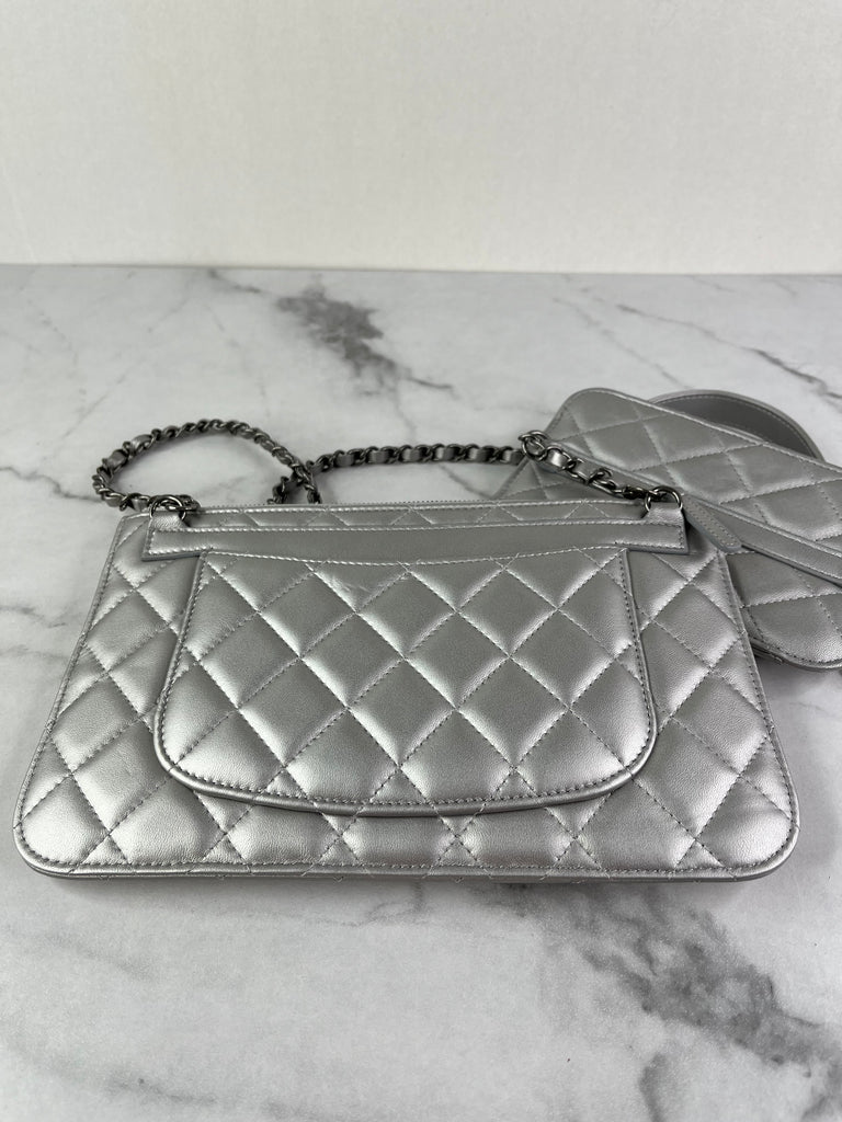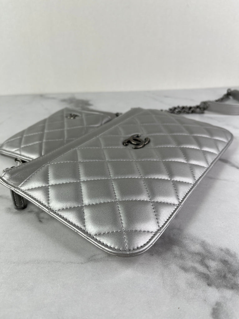 CHANEL Multi Pochette Metallic Silver Quilted Lambskin clutch/wallet/crossbody/shoulder bag