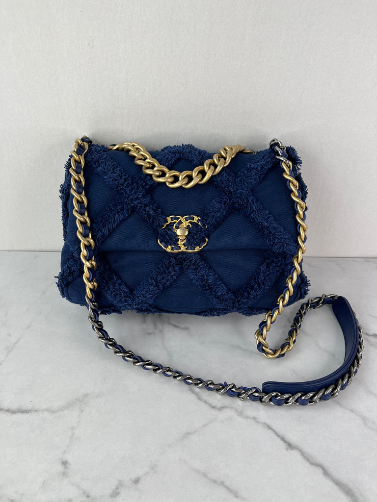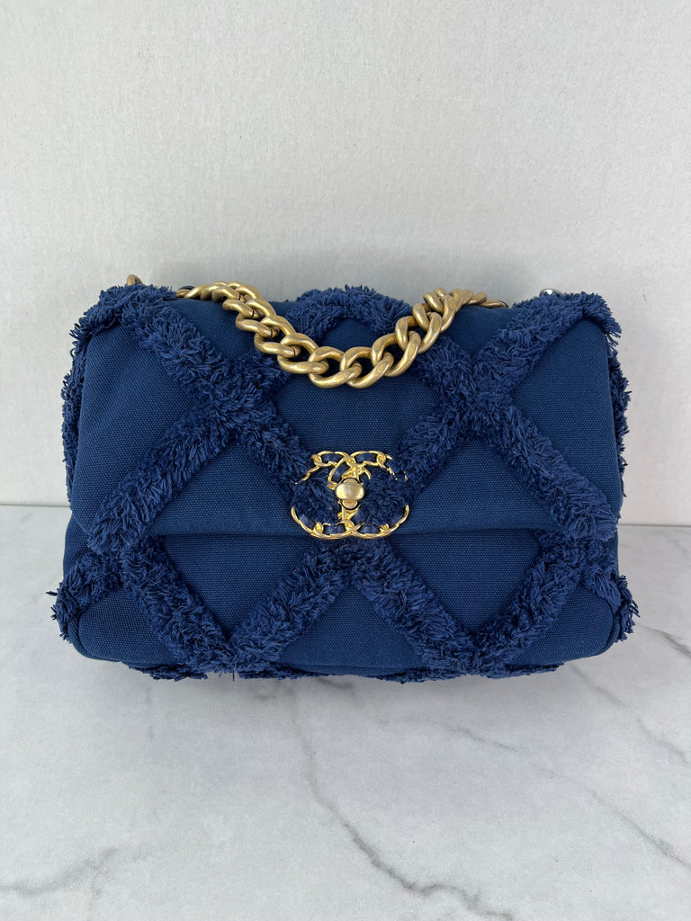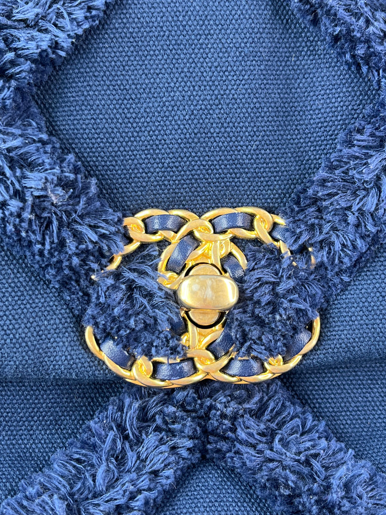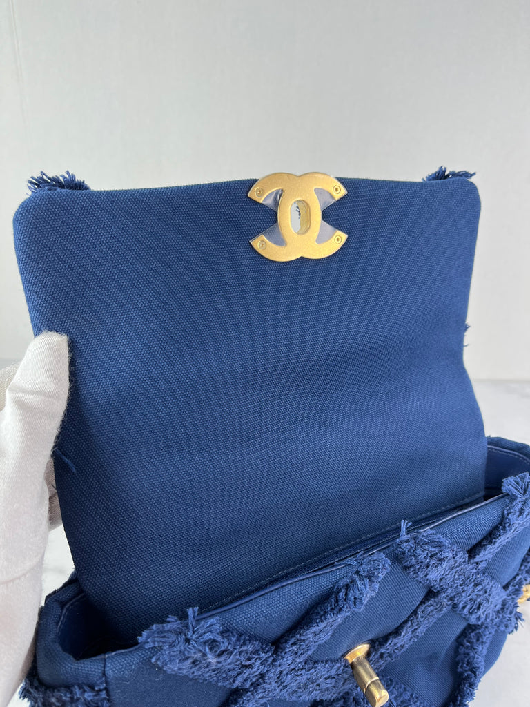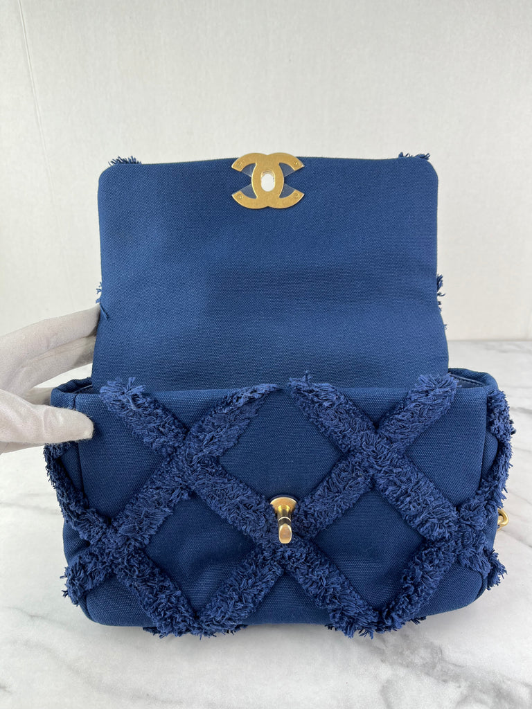 CHANEL Navy Blue Cotton Canvas Quilted Small/Medium Chanel 19 Flap Shoulder/Crossbody Bag