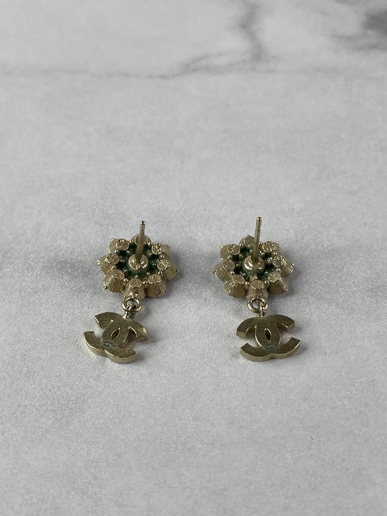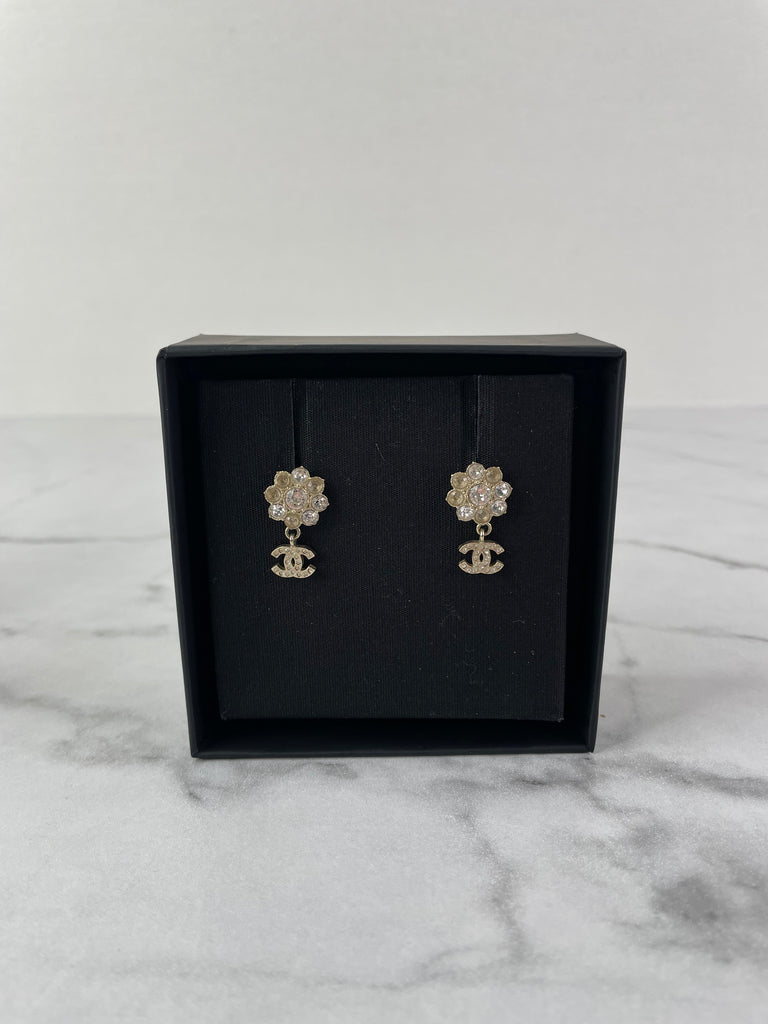 CHANEL CC Flower Drop Earrings Metal and Crystals $750.00 Default Title - $750.00 Quantity This product is currently sold out. CHANEL CC Flower Drop Earrings Metal and Crystals Condition: Pristine condition. 9.5/10. Very minor surface wear. One earring back is replacement. Includes: Box, pouch. Details: Gold tone hardware. Total height is 0.9”, width 0.5”.